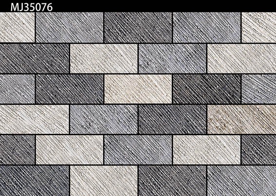 Textura: Padrão tipo tijolo, com peças retangulares e textura marcada de pedra, dispostas em paginação regular e contínua