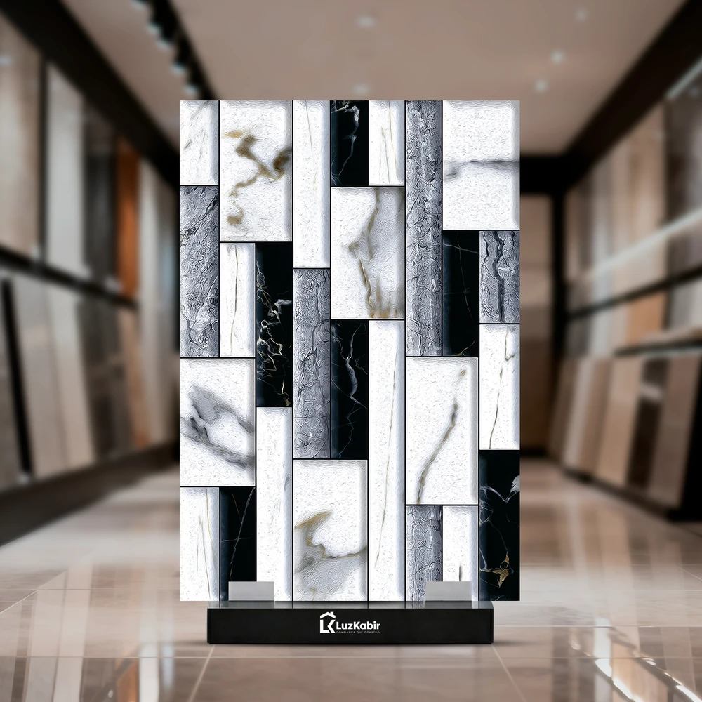 Textura: Padrão tipo tijolo com efeito pedra/mármore e contraste entre peças claras e escuras