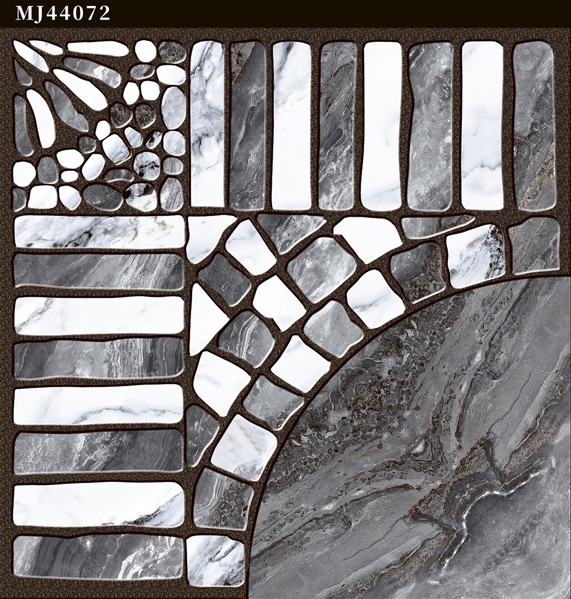Textura: Combinação de módulos com formatos distintos, incluindo retângulos alongados, peças irregulares tipo seixo e segmentos curvos. Presença de áreas com veios marcados e contraste entre superfícies lisas e texturizadas