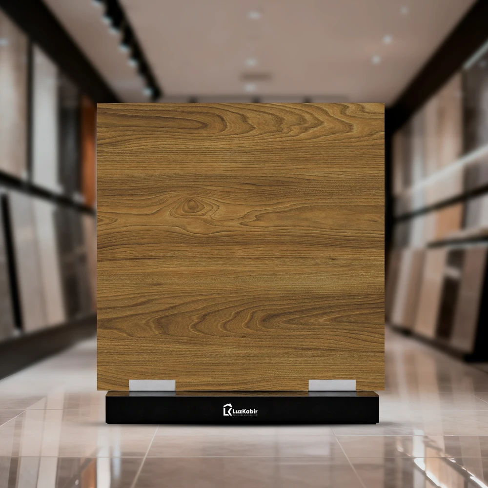 Textura: Superfície com efeito madeira em tom castanho médio, veios bem definidos e aparência natural, remetendo à madeira tradicional