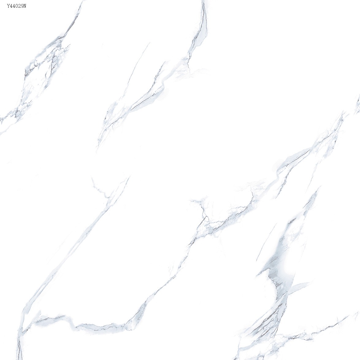 Textura: Superfície com efeito mármore branco tradicional, veios finos e suaves em tons de cinza claro com leve nuance azulada, visual limpo e elegante