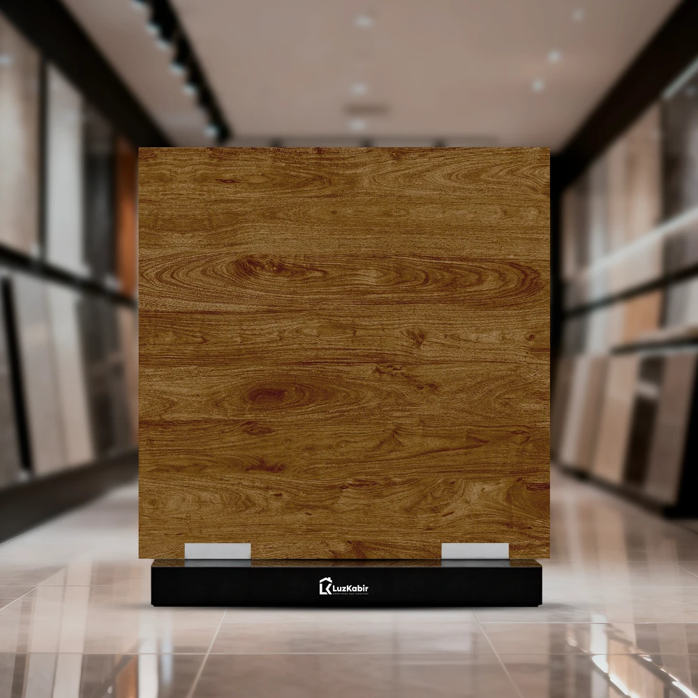Textura: superfície com efeito de madeira natural, de tonalidade média a escura, marcada por veios orgânicos bem definidos e nós visíveis, criando um aspeto robusto, profundo e tradicional, típico de madeira maciça envelhecida