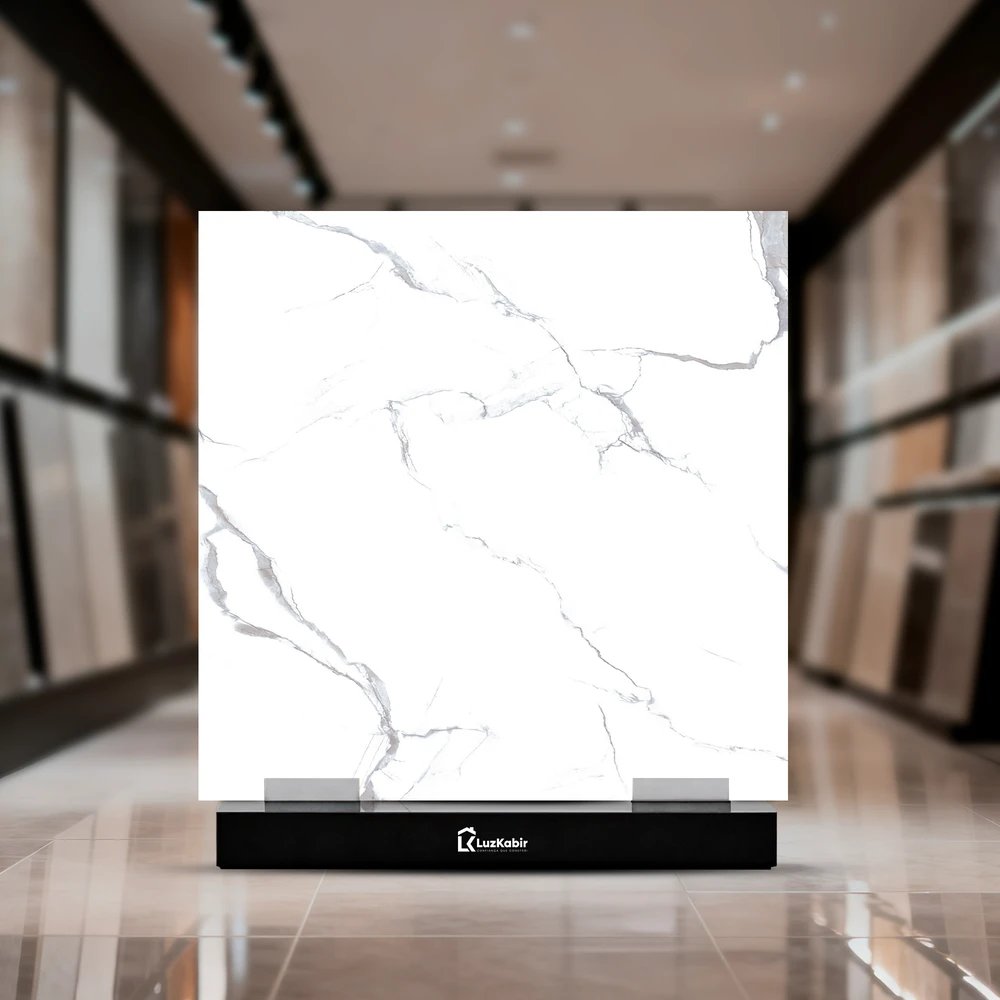 Textura: Superfície com padrão de mármore, veios largos e irregulares ramificados, distribuídos de forma orgânica sobre fundo branco uniforme