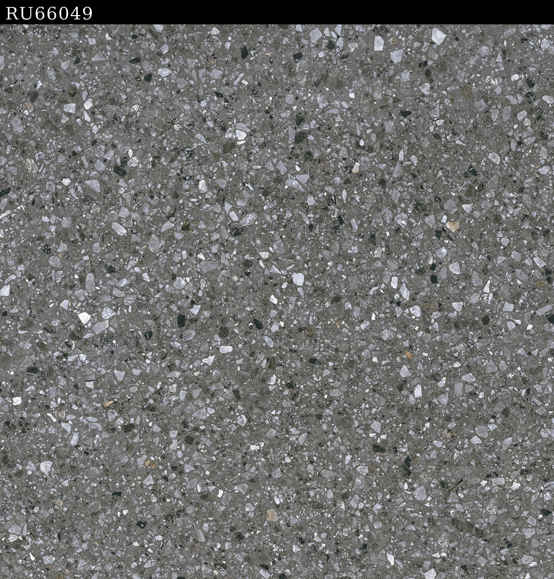 Textura: Superfície com padrão tipo terrazzo, fragmentos irregulares de pedra de pequeno e médio tamanho distribuídos de forma homogénea sobre fundo escuro contínuo