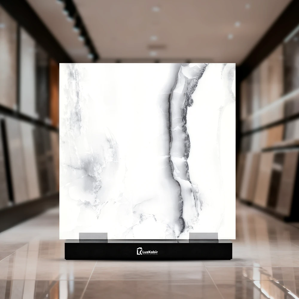 Textura: Superfície de base branca com áreas de tonalidade difusa e uma veia vertical marcada em cinza médio, com bordas irregulares e aspeto de pedra natural seccionada, apresentando contraste entre zonas mais lisas e áreas de maior densidade mineral