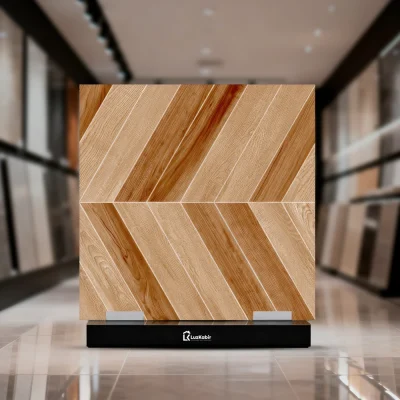 Textura: Revestimento com efeito madeira tradicional em padrão geométrico, veios bem definidos e combinação de diferentes tonalidades que criam um visual acolhedor e intemporal.
